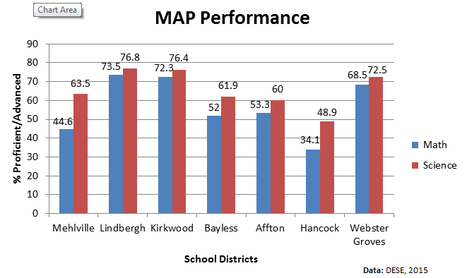 First, the graph below shows how Mehlville and the districts around it performed on the MAP test in 2015 in both math and science.