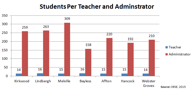 The graph below presents teacher/student and administrator/student ratios. Mehlville has more students per teacher than Kirkwood, but fewer students per teacher than Lindbergh, even though both are better-performing districts. Mehlville also has the highest student-to-administrator ratio in the area.