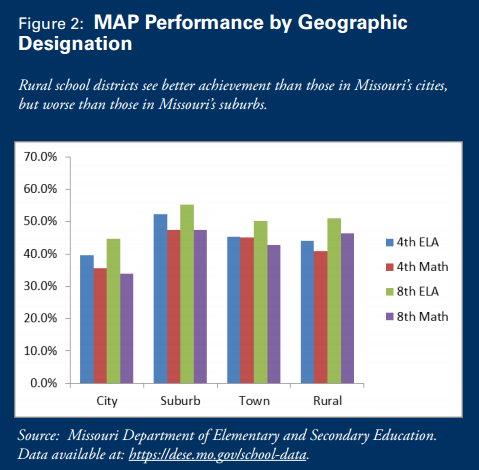 Figure 2 from the paper outlines Missouri MAP test results for 4th- and 8th-graders by geographic location. The MAP is a state standardized test administered to students in 3rd through 8th grade and then again in 10th grade. In the areas of math and English language arts, 4th-graders in the suburbs scored the highest followed by children in towns. However, 8th-graders in rural areas scored second-highest only to students in the suburbs. Unfortunately, city schools scored the lowest in every category.