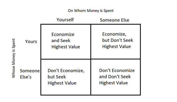 Spending your money on yourself is when you economize (reduce expenses) and seek the highest value, as you are both the one losing the money and receiving the product. The exact opposite is spending someone else’s money on someone else. You don’t economize or seek high value because it is neither your money nor do you receive the product; you have very little invested in the decision.