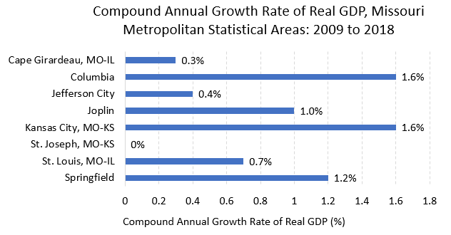 Missouri has eight metropolitan statistical areas (MSAs), a term used to describe a city with a population of at least 50,000 and the surrounding area. Below is a graphic from my latest publication, The 2020 Missouri Tax Landscape, which provides an overview of Missouri’s economy and taxes at the state and local levels. The compound annual growth rate (CAGR) of these MSAs is a calculated rate helpful for evaluating growth over time. While GDP growth is volatile, the CAGR provides a calculated rate as if the growth had occurred at a steady rate during the period.