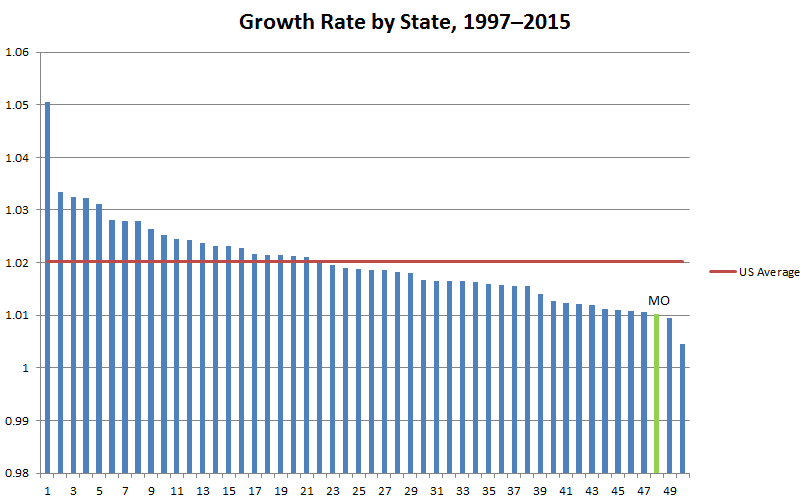 The Bureau of Economic Analysis recently released data on real GDP for all 50 states. Since Missouri’s growth in recent years has been nothing short of dismal—it was the 49th-fastest-growing state for the period 1997 through 2014—I thought it would be worthwhile to review the most up-to-date data for clues about what’s going wrong, and how it might be fixed.
