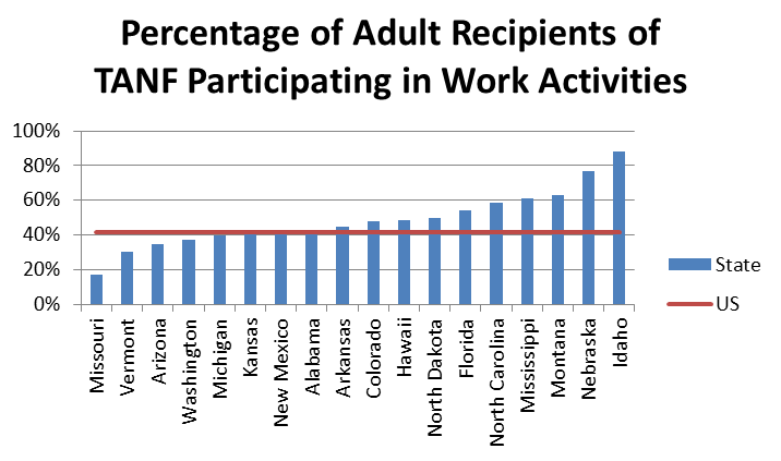 “Work-related activities” include both paid employment and things like job training and public-service work. The chart below shows participation rates among TANF recipients, and Missouri is dead last in the nation at 17%. (For clarity, the chart shows only 18 states, but the participation rates of all the omitted states fall between Missouri and Idaho.)