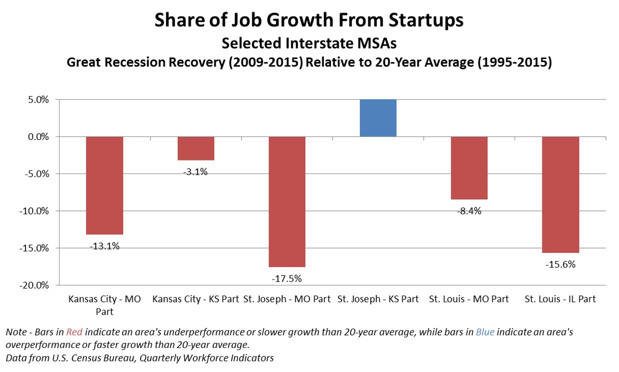 Why are there a smaller percentage of workers in startups, considering the state is at a new record high level for the number of non-farm jobs? Data suggest that Missouri startups are taking less of that job growth pie than they did before. Since 1995 to 2015, job growth from startups was near 72% of all job growth in the state of Missouri. If we look at this 20-year performance as a “normal” share of job growth from startups, then seeing a startup share at 62.5% should come as a disappointment. Of course, growing shares of workers in large, established firms can also spur growth. However, there are specific advantages that startups bring to a region that can be more difficult for established firms to provide. For example, research has shown that increased prevalence of startups can bring more innovation through increased competition (pp. 2–3) , allow for better adoption of new information, can create new industries (pp. 328–330), and improve labor productivity.  The graph below lists the share of startup job growth of Missouri, its metropolitan statistical areas (MSAs), and non-MSA portion relative to its 20-year average.