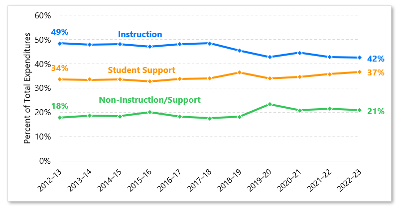 The 2018–19 school year marked the first large decrease in the share of instructional costs in total expenditures, and it has decreased further since then. If the trend continues, spending on student support services in Missouri may soon surpass instructional spending.