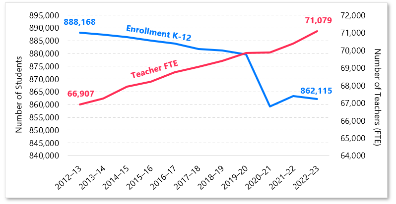 Figure 1 is even more fascinating when considering that the total number of teachers has continued to rise in Missouri, with student enrollment decreasing in the same time period. Even with 26,000 fewer students than in 2012–13, there are around 4,000 more Missouri teachers and 2,000 more student support staff (as of 2022–2023, the most recent data).