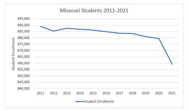 From 2011 to 2021, enrollment in Missouri public schools dropped by nearly 30,000 students. The largest drop was post-COVID, with the state losing over 20,000 students in that year alone. Nevertheless, the trend is clearly downward.