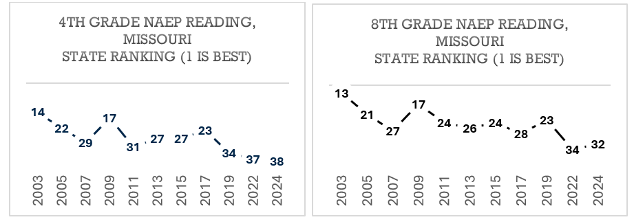 Most importantly, it will distract us from academic outcomes. Academics are where our schools are struggling, and until we focus on them, the situation is not going to improve. This is illustrated most easily with data from the National Assessment of Educational Progress, or NAEP, which is widely viewed as providing the most credible test data in the country. Here are charts showing changes over time in Missouri’s national rank on NAEP, in 4th- and 8th-grade reading, since about the turn of the century: