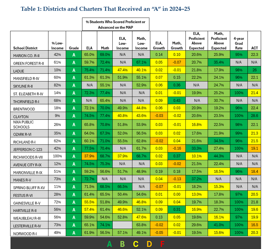 There is a lot more to delve into for academic performance. Table 1 is just one snapshot of what is available on MOSchoolRankings.org. Accountability tools like these can help highlight success stories, identify areas for improvement, and provide a clearer picture of how schools across Missouri are performing.