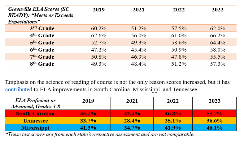 As I have discussed in previous posts, commitment to explicit phonics instruction could be key to making Missouri a leader in reading. Phonics instruction has a proven track record in independent research, in other states, and even in our own backyard. Back in 2019, the Greenville School District in South Carolina, with 77,000 students (largest in the state), failed to meet state literacy standards. Due to this, teachers in the district had to receive two years of training in the “science of reading” and use a new curriculum rooted in explicit phonics instruction. However, this “punishment” actually turned into a blessing: district scores on the SC READY state assessment have risen past pre-pandemic levels.