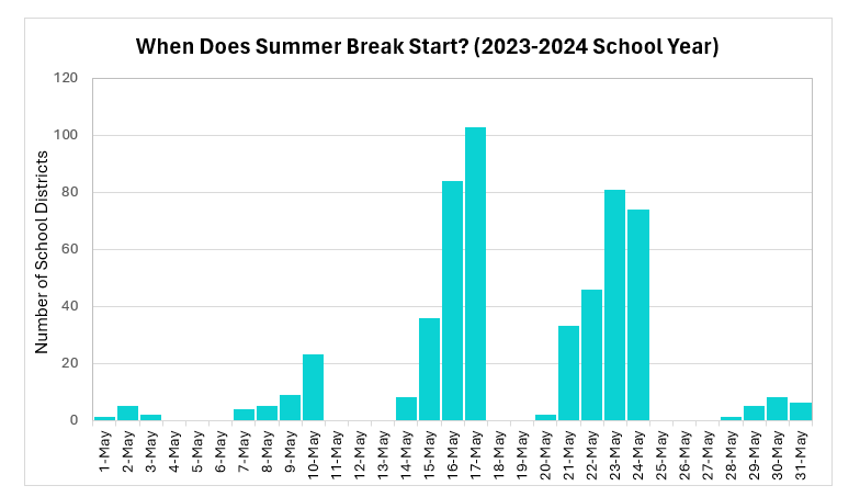 Skyline R-II was the first district to start summer break, on May 1. Hazelwood and Ferguson-Florissant will be among the final districts to go on break on May 31.