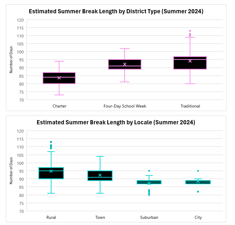 Another important takeaway from these figures is the difference in break length between charters and traditional schools. Charter schools have an average (mean) summer break of 84 days, versus 92 for four-day school week districts and 94 days for traditional five-day school week districts. In Missouri, charter schools serve high proportions of disadvantaged students and shorter breaks may be a good use of charter school flexibility.