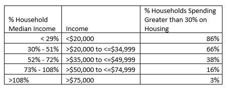 Using household income as our primary measure for housing affordability may make the most sense based on the data our government collects, but it is not a perfect measure for gaining insight into what households find affordable, especially for those with lower incomes. For example, if you don’t have a car or another means of transportation, housing that’s miles away from your place of work that costs 30% of your income is likely not affordable once daily commute costs are taken into account.