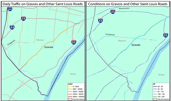 But MoDOT doesn’t have significant resources to spend on Gravois. And what money it does have is usually restricted, by law, to highway improvements (meaning that bike lanes, public transit upgrades, and other street beautification are excluded). Furthermore, MoDOT has to consider congestion and roadway quality, not just the aesthetic appeal of areas along Gravois. After all, it is the state transportation department, not an urban development office. And as things stand, Gravois Road is one of the busiest non-interstate roads in Saint Louis, with poor pavement conditions along much of the roadway, as shown in the maps below. (AADT refers to average annual daily traffic in the map on the left; in the map on the right, IRI refers to the International Roughness Index, a measure of road quality.)