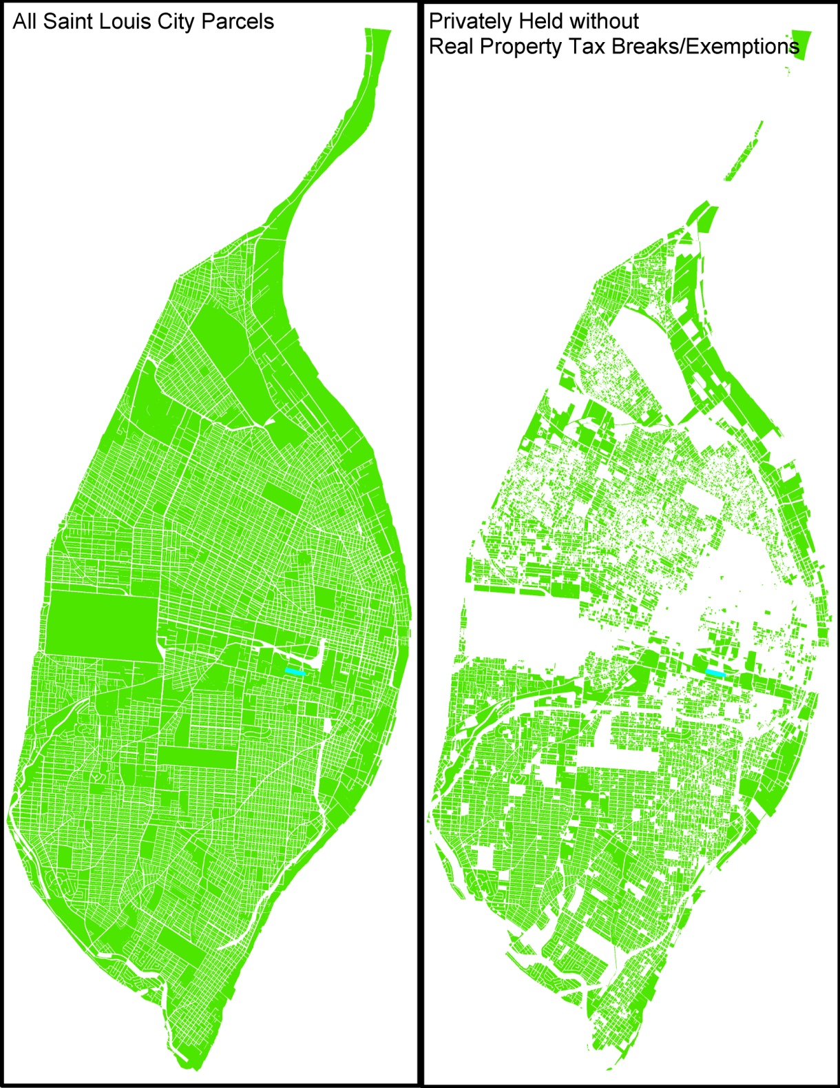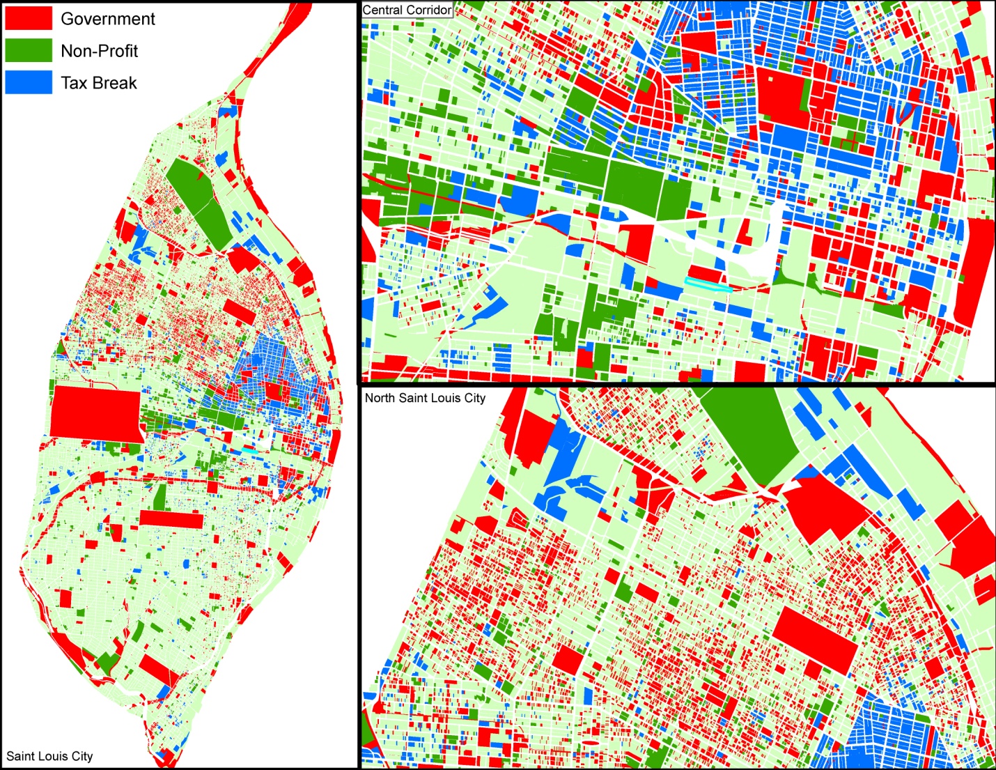 While the share of the city’s property that either gets tax subsidies, qualifies as a non-profit, or is owned by the government is large individually, looking at these issues together shows the scale of the problems confronting Saint Louis’s tax base. In fact, about half of the city’s property by area is either tax exempt or receives tax breaks. Property tax exceptions are basically the rule. The map below demonstrates this:
