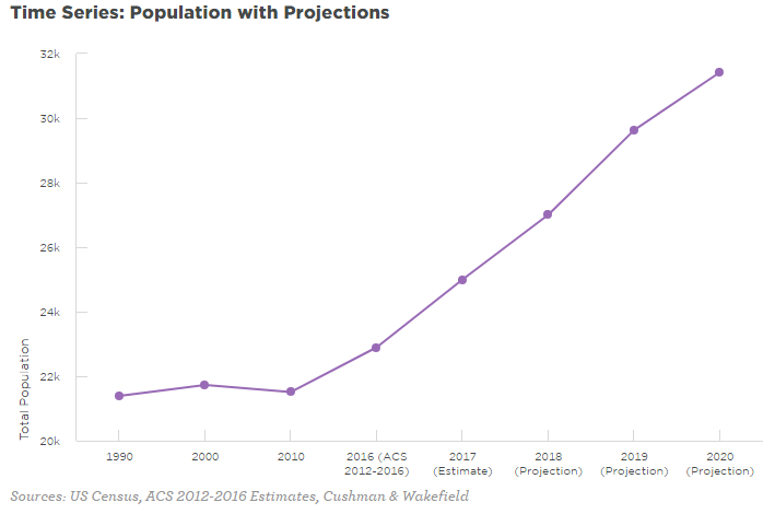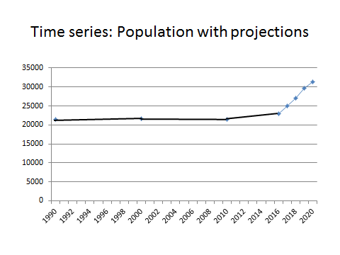 We took the exact same data points and spaced them more evenly on a time series chart. What you see is largely flat growth from 1990 through 2016. Then the population projection lines rocket upward. The report concedes that this is “unprecedented growth,” but does little to explain exactly why the next few years will be so radically different than the past few decades.