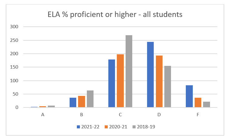Looking at the rates of proficiency for ELA at the school level (Figure 1), we can see that in 2018–19 grades were distributed in a fairly normal way, with slightly more D’s than B’s. In 2021–22, the number of B’s and C’s declined, while the number of D’s and F’s increased. Unfortunately, that trend continued in 2021–22, with the plurality of schools receiving D’s.
