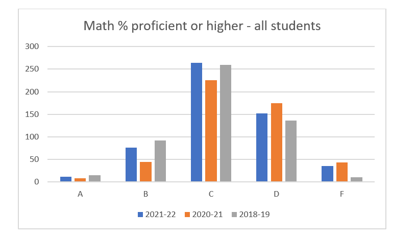 The same is not true for math, however (Figure 2). It appears that schools have recovered somewhat since the pandemic and the grade distribution looks more like it did three years ago.