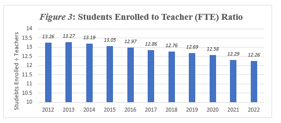 Student enrollment numbers have bounced back a bit from the COVID-19 dip and currently sit at 863,000. Nevertheless, prior to the pandemic, enrollment had been falling every year since 2013, and the 2022 number is still not close to the 2020 enrollment figure of 879,000. Conversely, teacher FTE (full-time equivalent) rose during the pandemic, and actually increased by a greater percentage (0.78%) than enrollment (0.41%) in 2022.