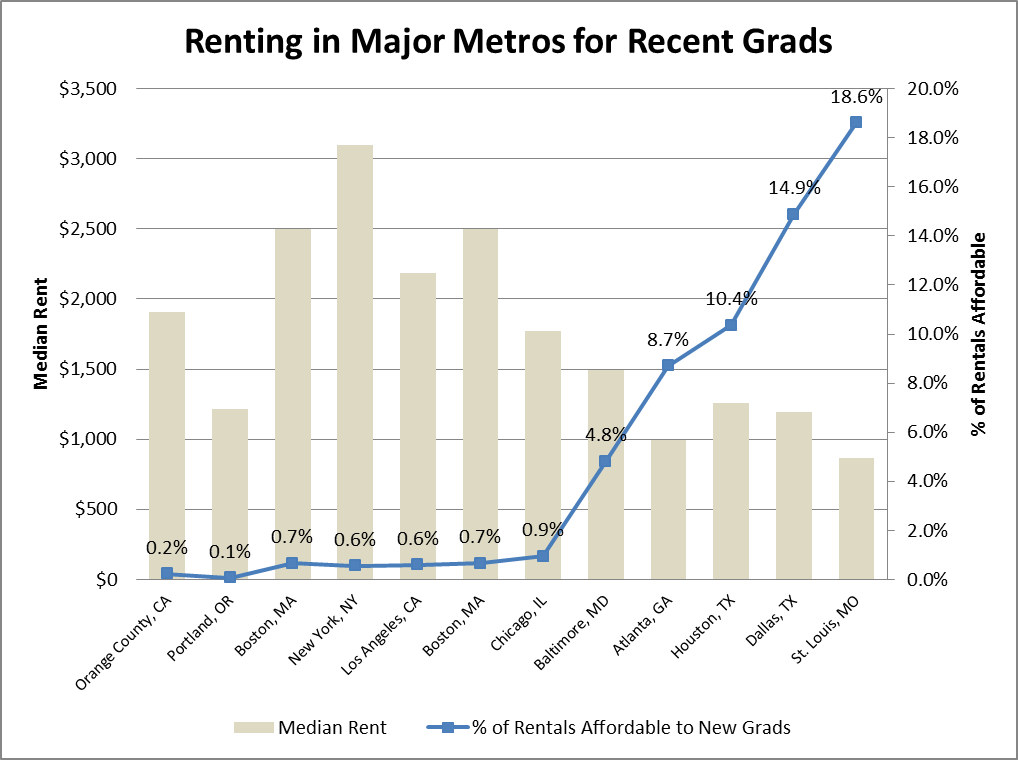 One might assume that the relationship here is one of growth and desirability. Saint Louis, with relatively low growth, is not as attractive as the fast-growing Portland or Miami. But economic growth is not the whole story, because following Saint Louis on the list of affordable metros are some of the fastest-growing metropolitan areas in the nation, including Houston, Dallas, Atlanta, and Phoenix. Most likely, multiple factors, including desirable weather and urban containment policies (of which Portland has been a very prominent example), are important in making a city unaffordable for young people. Put simply, it takes capped supply along with high demand for rent to become unattainable for the average grad.