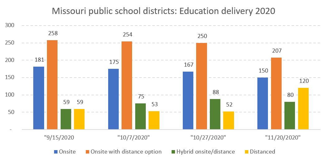 Then COVID exploded, and many of those plans became irrelevant. As we head into the holidays, almost one quarter of Missouri public school districts have gone back to the fully remote mode of last spring’s shutdown. And most districts that are continuing to operate in-person are very small, such that fewer than 74,000 of the nearly 870,000 Missouri public school students, or around 8 percent, are still learning completely in person, while over one quarter of Missouri students are now in districts that are virtual only.