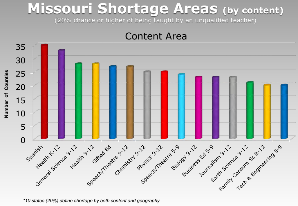 Dovetailing nicely with the research I have done on rural schools in Missouri, DESE’s slide shows there are shortages in more than 10 teacher certification categories in 16 counties across the state, and shortages in 43 counties in 5 to 9 categories.