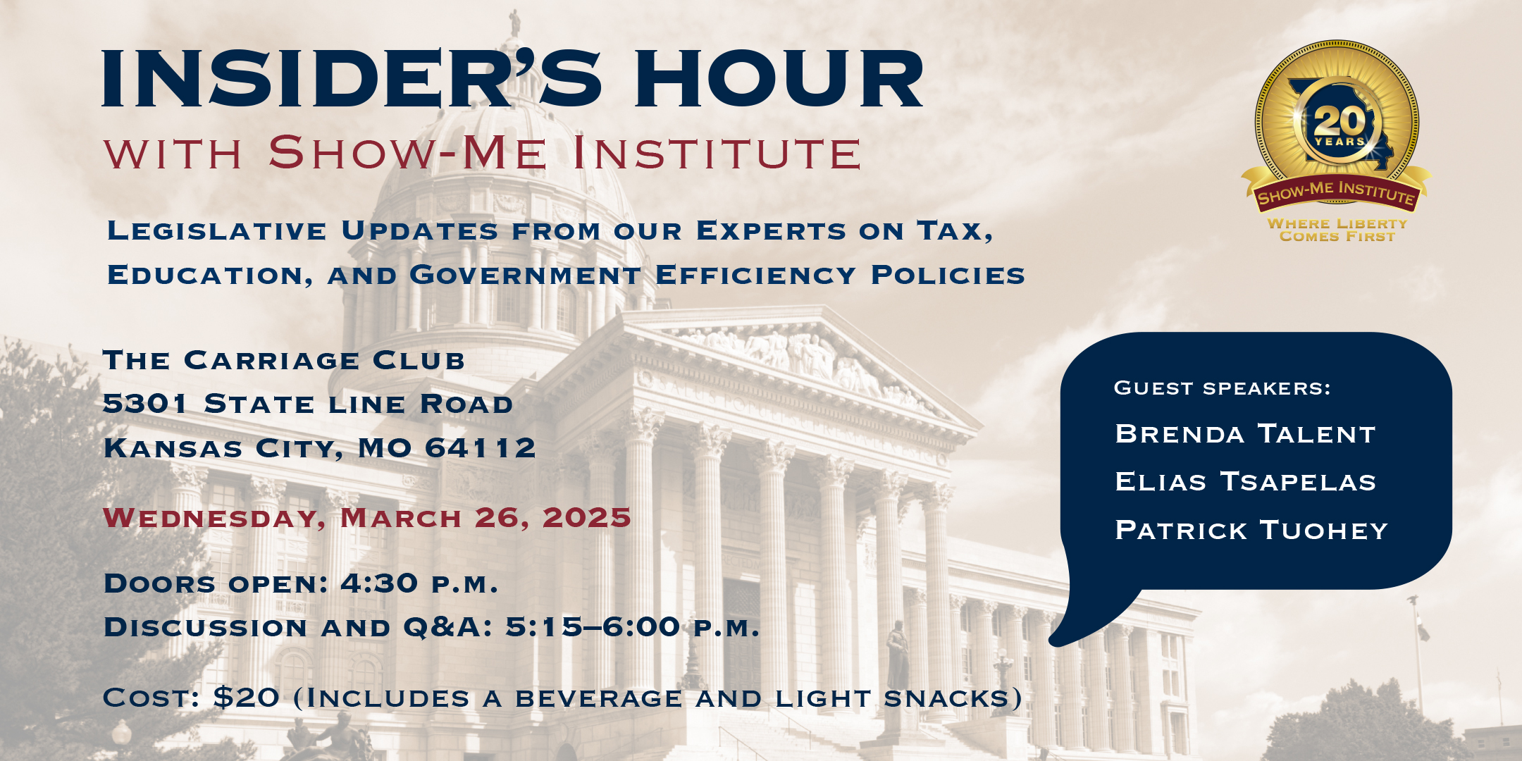 Get the inside scoop on the Missouri legislative session and policies that could directly impact the lives of Missourians at the Show-Me Institute’s Insider’s Hour! Join CEO Brenda Talent, Director of State Budget and Fiscal Policy Elias Tsapelas, and Senior Fellow Patrick Tuohey for a discussion on tax and education policy and the latest efforts to improve government efficiency.
