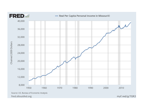 The two charts below tell the story. The first chart shows real personal income per capita (hereafter income), measured in 2009 dollars, for Missouri since 1950. In that year income stood at $10,168. By 2015 it had risen to $38,612. That almost-fourfold increase means that individuals today are, on average, much better off than they were in 1950. That’s the good news.