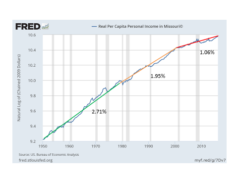 The second chart uses the same data, this time shown using a log scale for income. That means we can look at the slope of the line to better see how fast income has been growing over time. I have picked out what look to me like three fairly distinct stages of decline. The first runs from 1950 through 1979, and is highlighted with a green line. During these three decades Missouri income increased at an annual average rate of about 2.7 percent. The next period runs from 1980 through 1999 and is delineated by the amber line. During this period income in Missouri grew at an average annual rate of less than 2 percent, a notable drop from the previous period. The final stage, shown by the red line, is the period since 1999. So far in this century, income in Missouri has increased at an average rate of just slightly more than 1 percent per year. Income in Missouri today is increasing at about a third of the pace that it did 40 years ago.