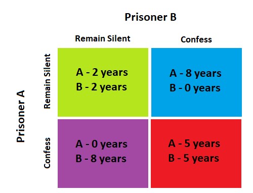 In the classic prisoners’ dilemma situation, two armed robbers have been captured by the police, but there isn’t enough evidence to convict them, so they are questioned separately. Each prisoner can either confess and throw his partner under the bus in exchange for a deal, or remain silent. However, each prisoner knows his sentence is also influenced by the other prisoner’s actions. The police have outlined four scenarios for each prisoner, which are shown in the diagram below. The left side shows the options for Prisoner A, the top shows the options for Prisoner B, and each square shows the results of the corresponding actions.