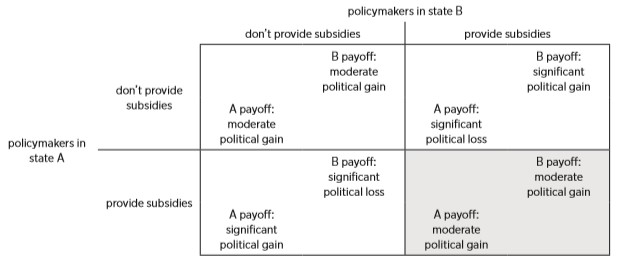 Policymakers feel pressure to provide subsidies because “voters want policymakers to do what they can to outcompete other states for economic development.” (p 15). Policymakers are incentivized to provide subsidies, so we end up in the bottom-right square.