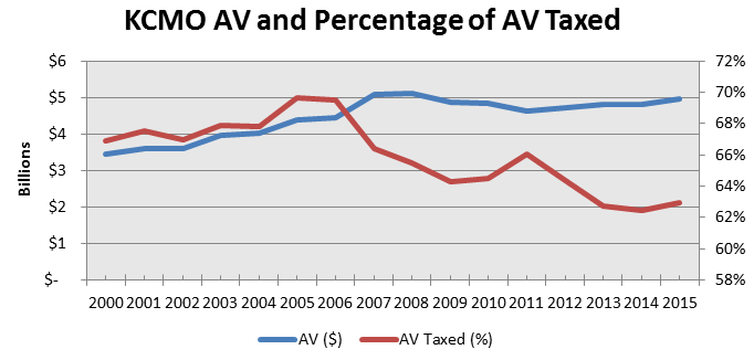 In the chart below, the blue line shows the total assessed value of real property in Kansas City, Missouri. The red line shows the percentage of that property value that is taxed. Clearly, the two measures are heading in different directions; as more and more real estate is developed in the city, a lower and lower percentage of property value is taxed.