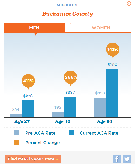 Amazingly, that 271 percent figure conceals something else about Buchanan that is just jaw-dropping. If you use Forbes’ national rate navigator, you discover that a 27-year-old man in Buchanan County can expect an individual insurance policy rate increase of — get this — 411 percent.