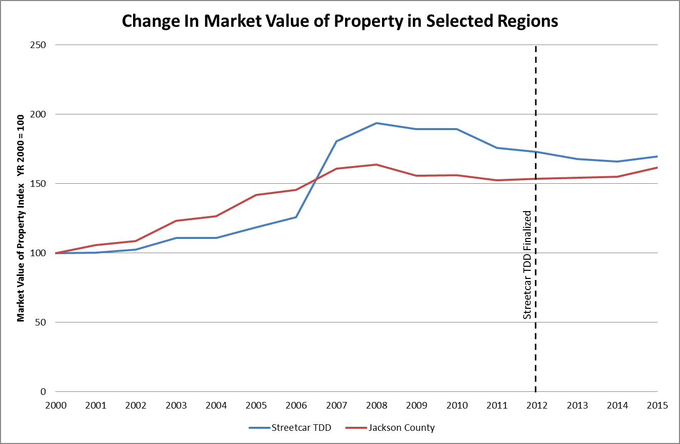 If we simply look at market values after the streetcar’s TDD was finalized in 2012, Jackson County as a whole performed better than the TDD. This directly contradicts the idea that the Kansas City Streetcar is boosting development downtown: