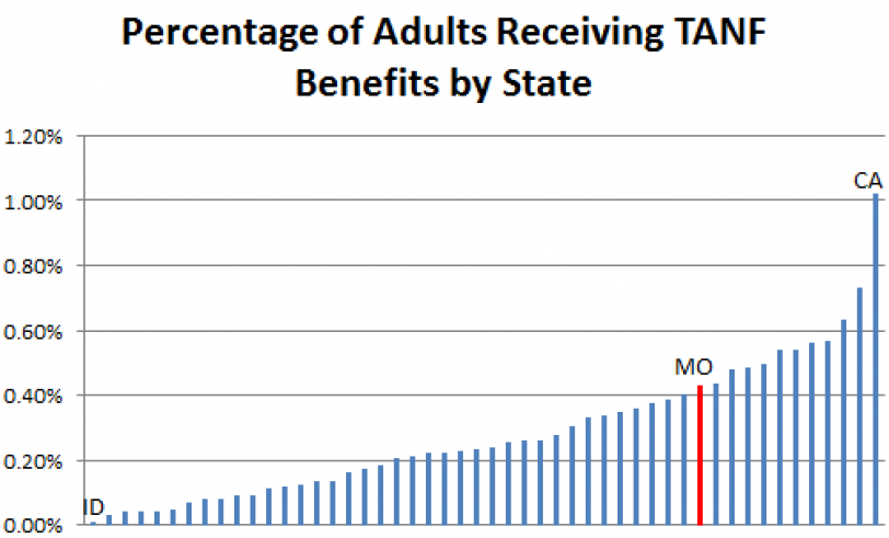 Currently, DSS only determines eligibility annually. Thus someone could move to another state between eligibility checks and could continue receiving benefits for up to a year. As of 2014, Missouri had a large percentage of the adult population on welfare compared to other states, ranking twelfth in participation rates (see the chart above).