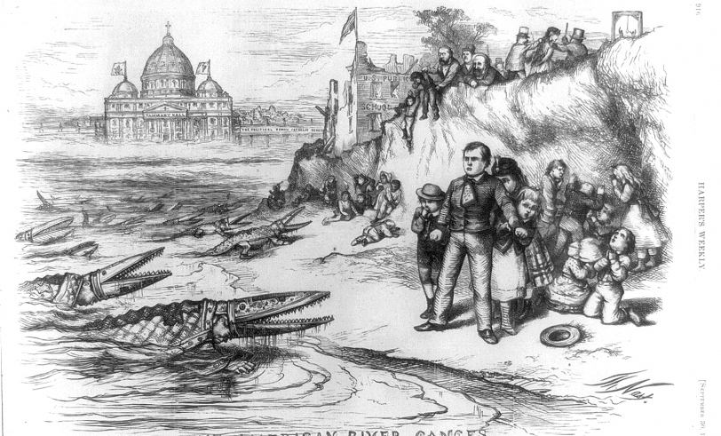 To save you the runaround, the answer is no. At best, he and his compatriots were political opportunists who saw alienating Catholics as a winning political strategy in the age of Know-Nothingism. At worst, he was an anti-Catholic bigot. The “sect” that he was referring to was Catholicism. Don’t believe me? Look closely at the famous Thomas Nast cartoon (above) from the era. Yes, those alligators are bishops, the capitol is the Vatican, the public school is under siege, and a teacher is being led to the gallows. Not our nation’s finest hour.