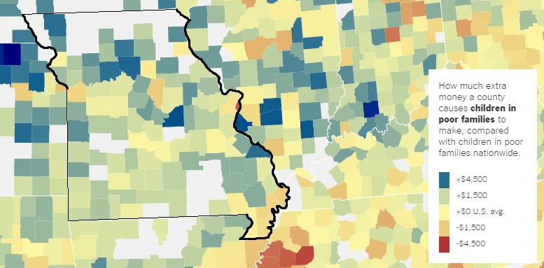 The researchers partnered with The New York Times to create a searchable data visualization of every county in America and its neighborhood effect on lifetime earnings. Missouri is shown below (on the map, blue is good and red is bad.)