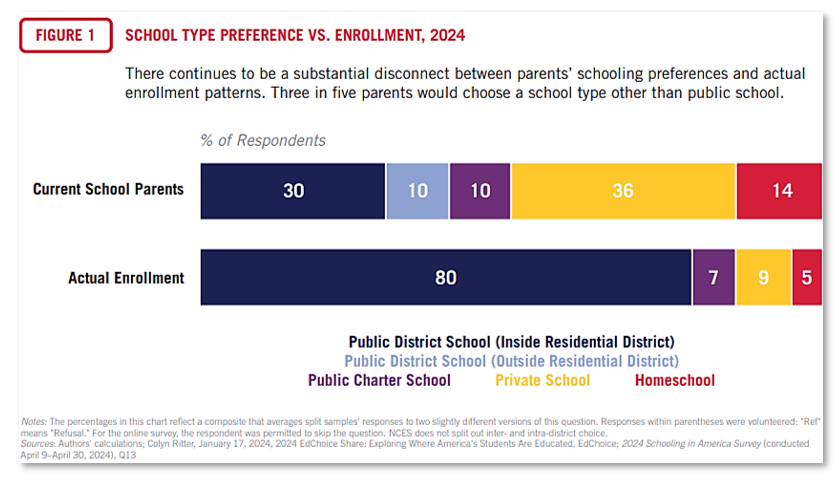 Families (and even individual children within a family) have different needs. Education options should reflect that reality, and private schools are not a feasible choice for many families without financial assistance. EdChoice recently released a 2024 survey comparing educational preferences to actual enrollment numbers.