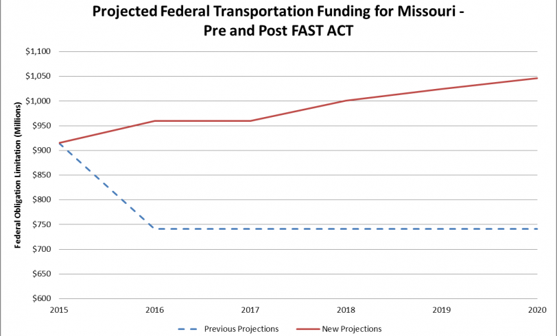 However, in an ironic twist, the increased federal support promised under the FAST Act could once again put Missouri in a bind. As we’ve discussed before, the federal government gives highway funding to states in the form of individual project grants, not as a lump sum. This means that for MoDOT to get federal money for highways, it needs to spend state money. Thus, increased federal support through the FAST Act requires increased state spending.