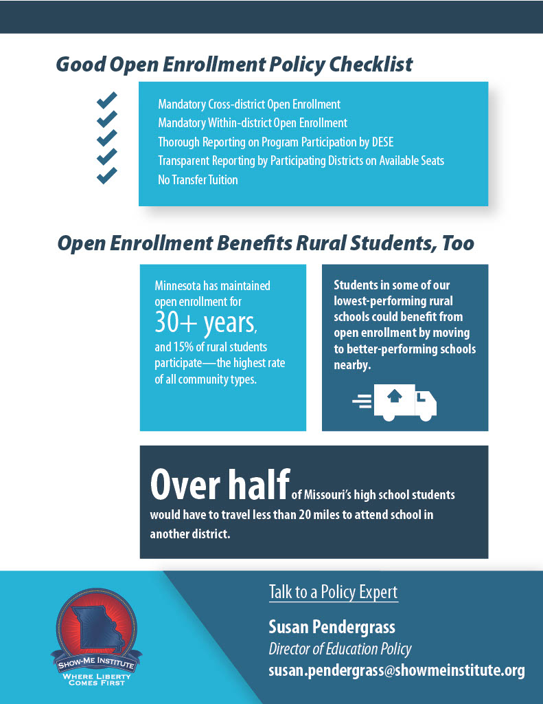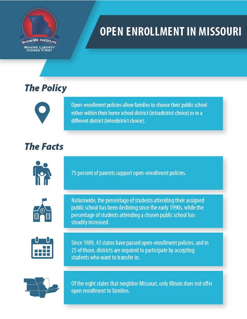 Download Entire Policy PacketOpen-enrollment policies allow families to choose their public school either within their home school district (intradistrict choice) or in a different district (interdistrict choice). The Reason Foundation issued a report that noted elements of a strong open enrollment policy. Those elements are incorporated in this example of a model policy. Such a policy would allow Missouri to compete with the states that have strong open enrollment laws. Below you’ll find an infographic highlighting key facts, possible reforms to current law, and a full policy brief.