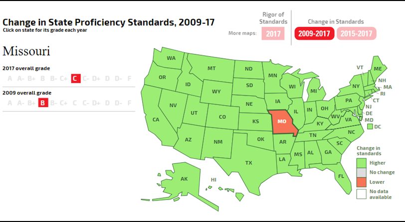 Marching to the beat of your own drummer is all good and well as long as you know where you’re going. A recent study published in Education Next suggests that Missouri—alone out of all 50 states—is headed in the wrong direction with regard to state proficiency standards for students. The study compares how well students in each state do on their states’ proficiency tests to how well they do on the National Assessment of Educational Progress (NAEP). For example, if 25 percent of students in a state scored proficient on the state’s test, but 50 percent scored proficient on the NAEP, that would indicate that state’s proficiency standards are more rigorous than the national standards. Since states have different state assessments and the NAEP is administered in every state, the NAEP serves as a Rosetta stone and allows us to compare the standards of different states. According to the analysis, every state in the nation increased the rigor of their proficiency standards from 2009 to 2017. . . except Missouri. This could have significant implications for Missouri students, especially students in Missouri’s most disadvantaged school districts.