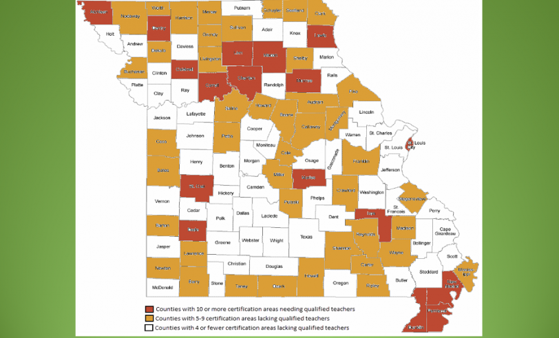 Dovetailing nicely with the research I have done on rural schools in Missouri, DESE’s slide shows there are shortages in more than 10 teacher certification categories in 16 counties across the state, and shortages in 43 counties in 5 to 9 categories.